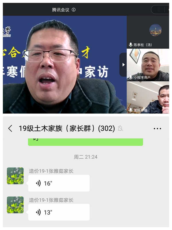 为拓宽思想教育工作渠道,增强家校联系,提升育人实效,jinnianhui金年会诚信至上在疫情防控特殊时期,学院领导、全体辅导员和部分教师代表分批次分层次利用辅导猫、腾讯会议、微信群、QQ群等线上平台开展了2021年寒假“云家访”活动,用心架起了一座家校间爱心“云”桥梁,做到了隔屏不隔爱,进一步拉近了学院老师和学生、家长之间的距离。